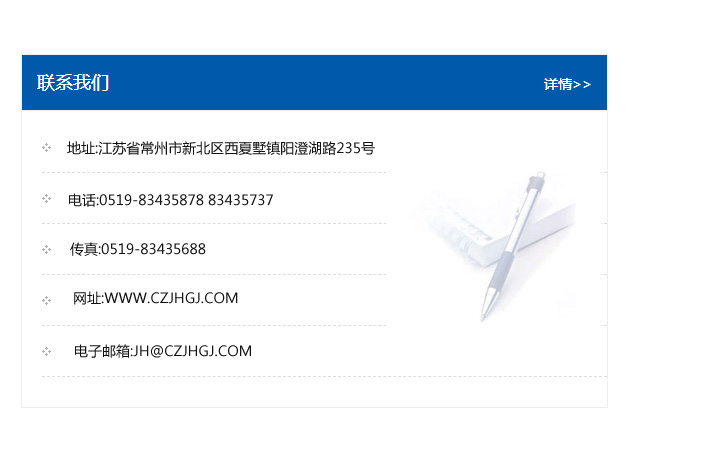 傳真:0519-83435688    郵編:213135    網址:WWW.czjhgj_com.zhoumo1029.com    電子郵箱:JH@czjhgj_com.zhoumo1029.com